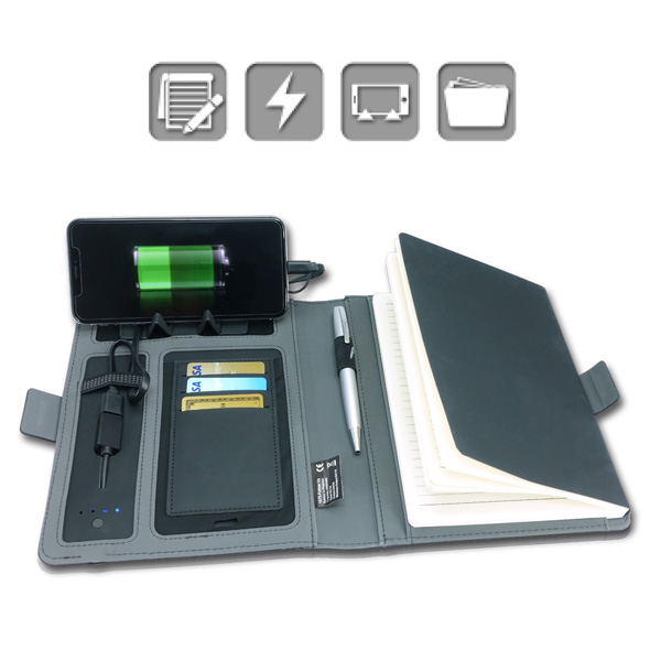 מחברת מכתבייה ארגונית עם POWER BANK בנפח 5000MAH. חומר הכריכה הינו בד איכותי בצבע אפור עכבר. סגירה מגנטית. מחברת בינלאומית בגודל A5 עם שורות 65 דף. מתאמי טעינה למכשירי אייפון, אנדרואיד ו type-C.