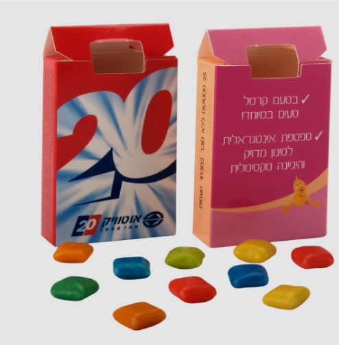 קופסת מסטיקים ממותגת - אריזות המכילות מסטיקים צבעוניים בטעמי פירות