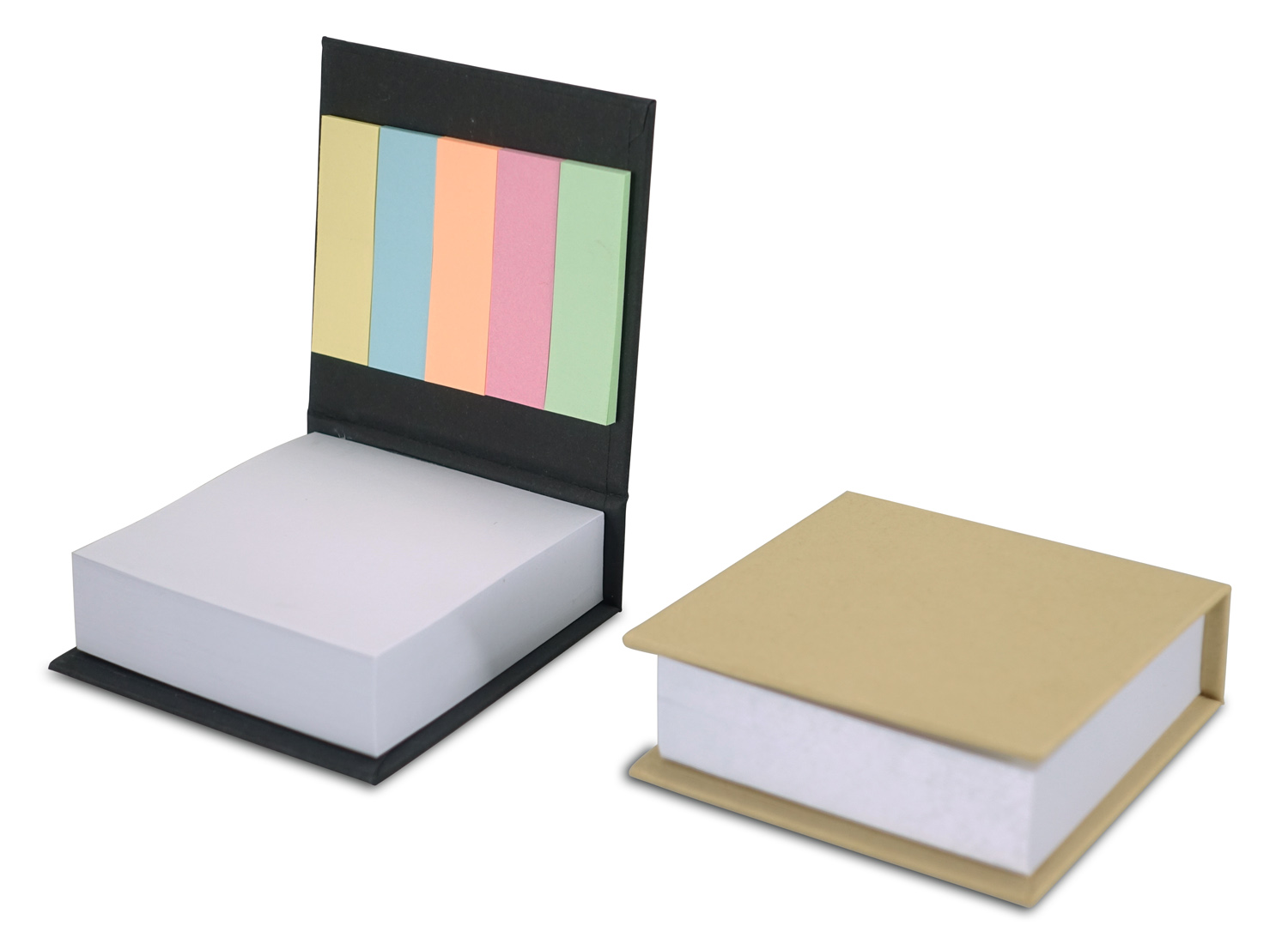 מעמד שולחני לניירות ממו ועטים. מכיל ניירות ממו, ניירות ממו דביקים, אטבים ודגלונים במבחר צבעים. מגיע בצורת קוביה.