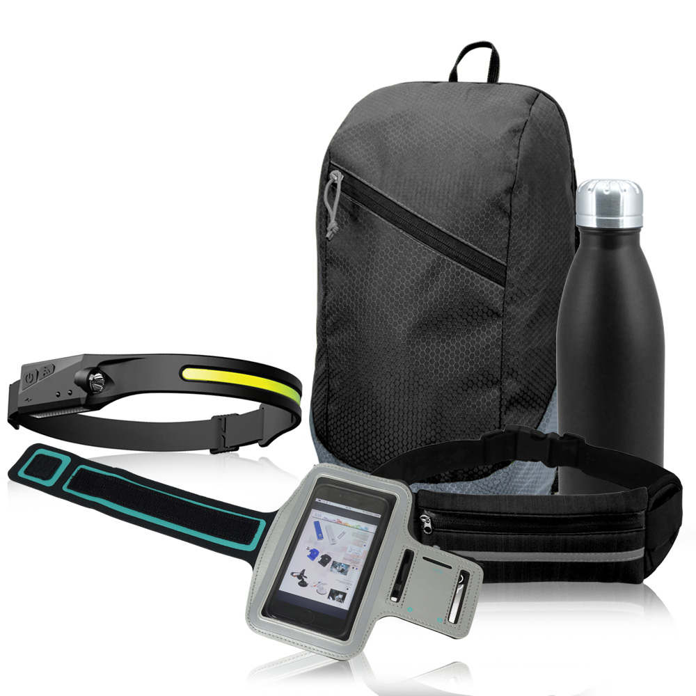 סט מתנה הכולל: תיק גב קומפקטי מעוצב 10L. בקבוק נירוסטה תרמי 500ML. נרתיק ספורט לזרוע למכשירים ניידים. פאוץ למותן עם פס מחזיר אור.