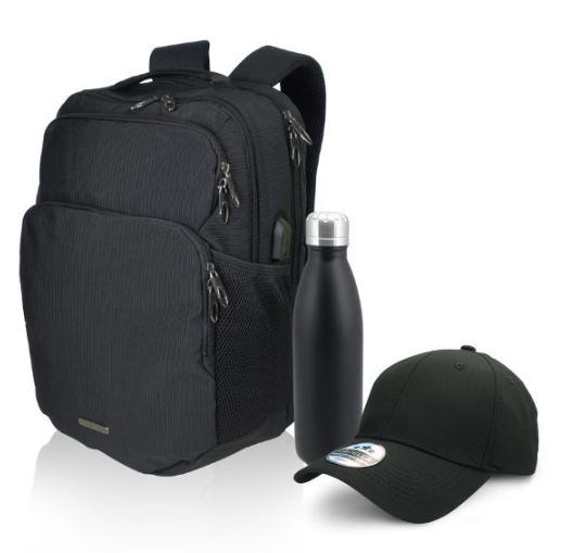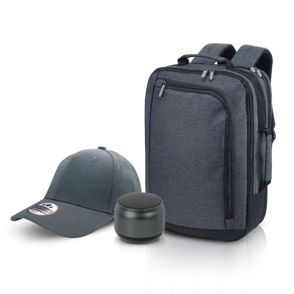 סט הכולל: תיק גב חדשני למחשב נייד המתהפך לתיק צד + כובע אופנתי מבית 'CAPELLA' + רמקול בלוטוס מיני מעוצב.