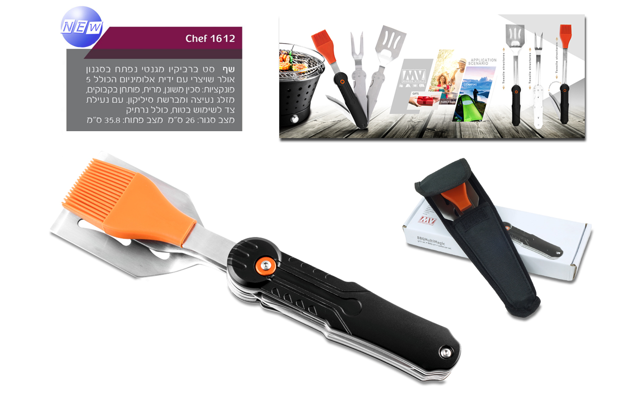 'שף' - סט ברביקיו גאדג'ט מגנטי נפתח בסגנון אולר שוויצרי עם ידית אלומיניום ו-5 פונקציות - סכין משונן, מרית ,פותחן בקבוקים, מזלג נעיצה, מברשת סיליקון. מידות: מצב סגור: 26 ס'מ. מצב פתוח:35.8 ס'מ.