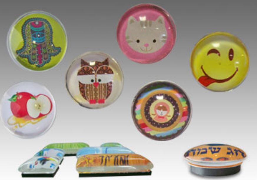 מגנטי זכוכית יוקרתיים בצורות שונות: עיגול, ריבוע, ולב.