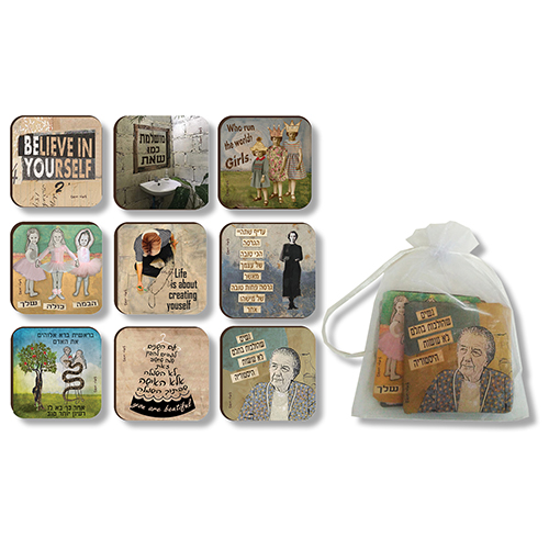 סטנד עם כרטיסי העצמה לנשים ופרחים מיובשים. בצדו השני של כל כרטיס מצורפת שאלה המנעיה לפעולה. גודל הכרטיס 10×15 ס”מ , גודל הסטנד 19.5×5 ס”מ.