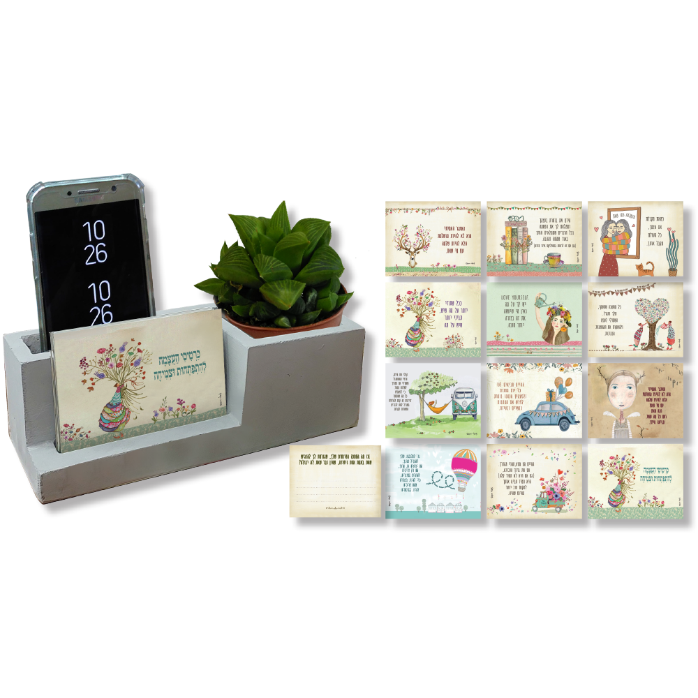 אורגינייזר שולחני מבטון עם כרטיסי העצמה להתפתחות וצמיחה וסקולנט. מידת האורגינייזר 7x7x21 ס”מ, גודל הכרטיסים 9.5×7.5 ס”מ. בצדו השני של כל כרטיס מצורפת שאלה המניעה לפעולה.