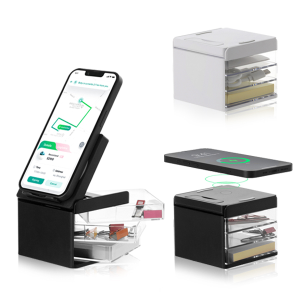 'טופר' - מטען אלחוטי שולחני 10W מבית EVERCHARGE משולב עם סטנד לסמארטפון המתקפל למצבי גובה שונים, 7×8.5×8.5 ס'מ. 3 מגירות קטנות לאחסון וארגון. מגיע עם כבל טעינה.