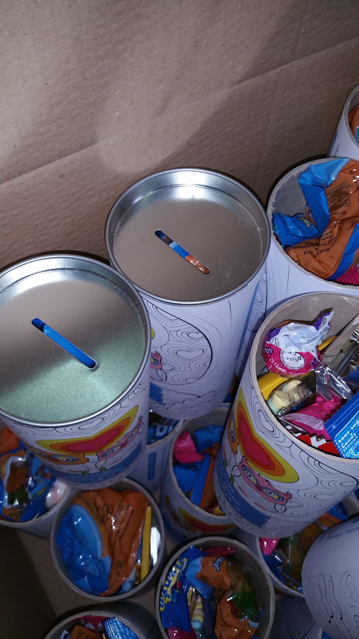 קופסת פח קופת חיסכון ממותגת עם 44 נרות חנוכה.