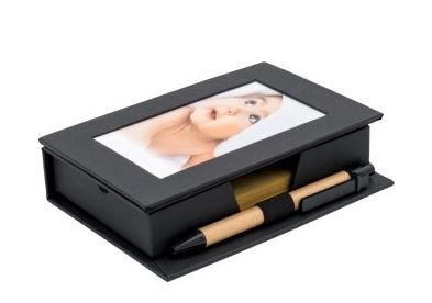 מעמד ניירות ממו ממוחזר עם תמונה ועט. מידות: 16x11.5x3.5 ס'מ. קופסת ממו גדולה עם מקום לתמונה נשלפת כולל ניירות ממו ועט ממוחזרים.