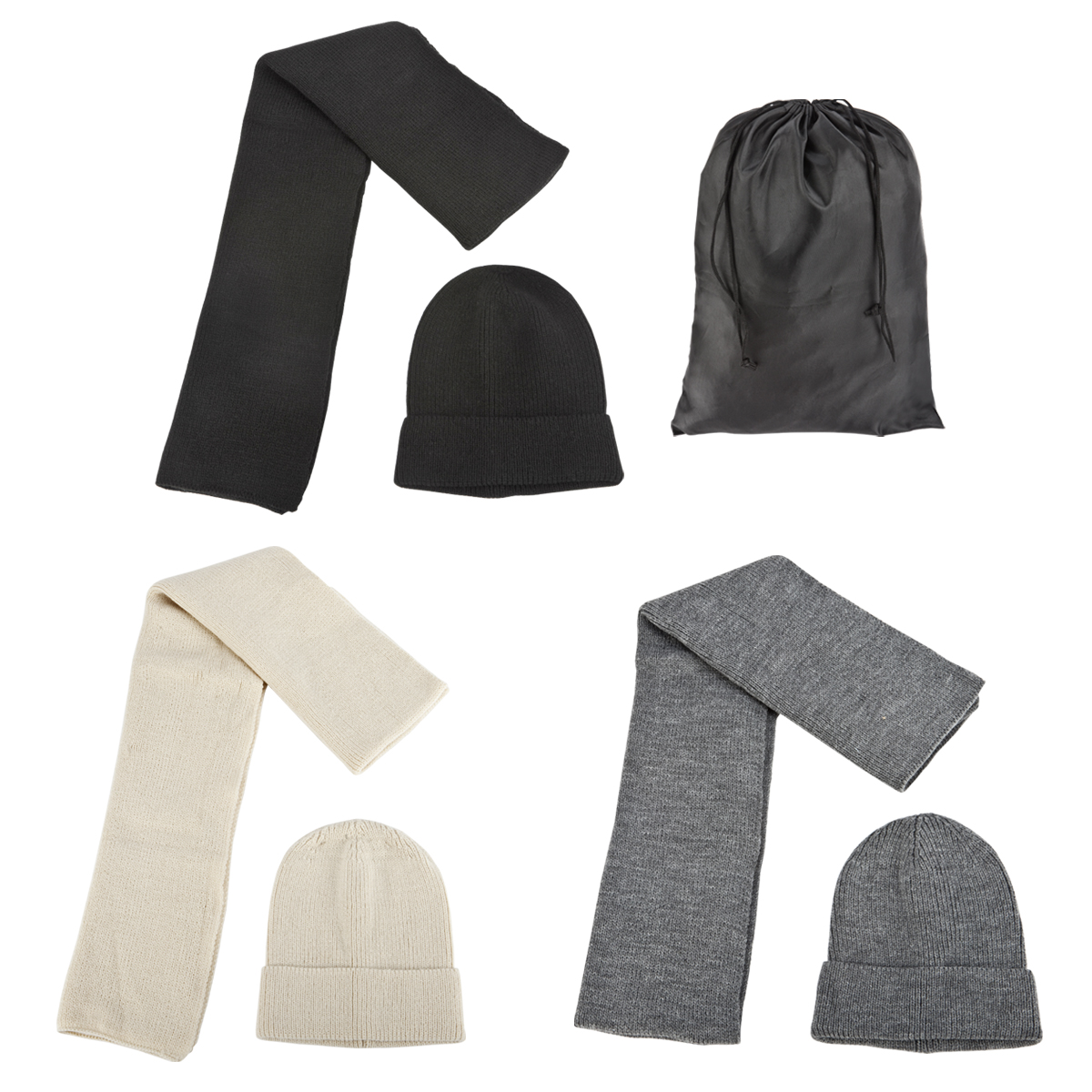 לג’נד - סט של כובע גרב וצעיף. עשוי מ-100% אקריל באריגה מיוחדת. כל סט ארוז בשקית בד. מידות כובע: 18.5x21 ס”מ. מידות צעיף: 154x25 ס”מ .